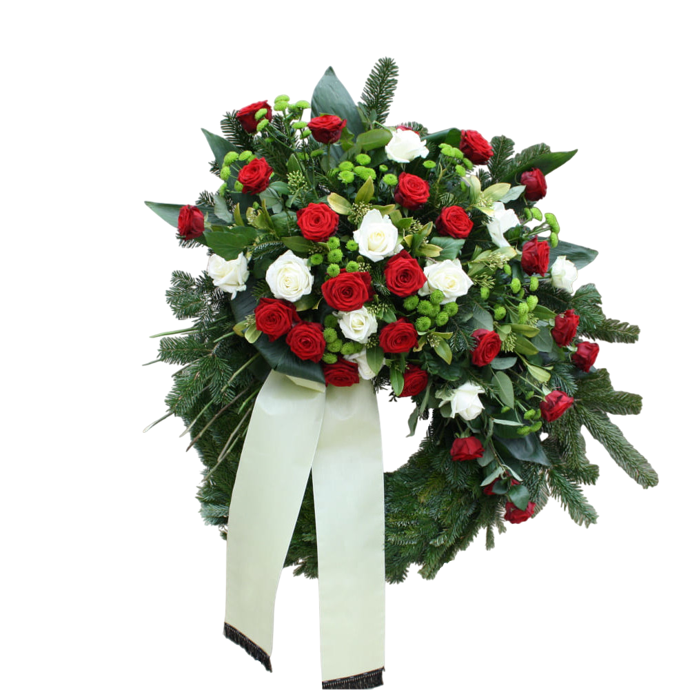 Ein stilvoller und würdevoller Abschied: Unser handgefertigter Trauerkranz besteht aus edlen roten und weißen Rosen, kombiniert mit Santini und Tannenzweigen. Die klassische Farbgebung drückt Liebe, Respekt und Verbundenheit aus. Eine cremefarbene Schleife mit Fransenabschluss bietet Raum für einen letzten Gruß oder persönliche Worte.