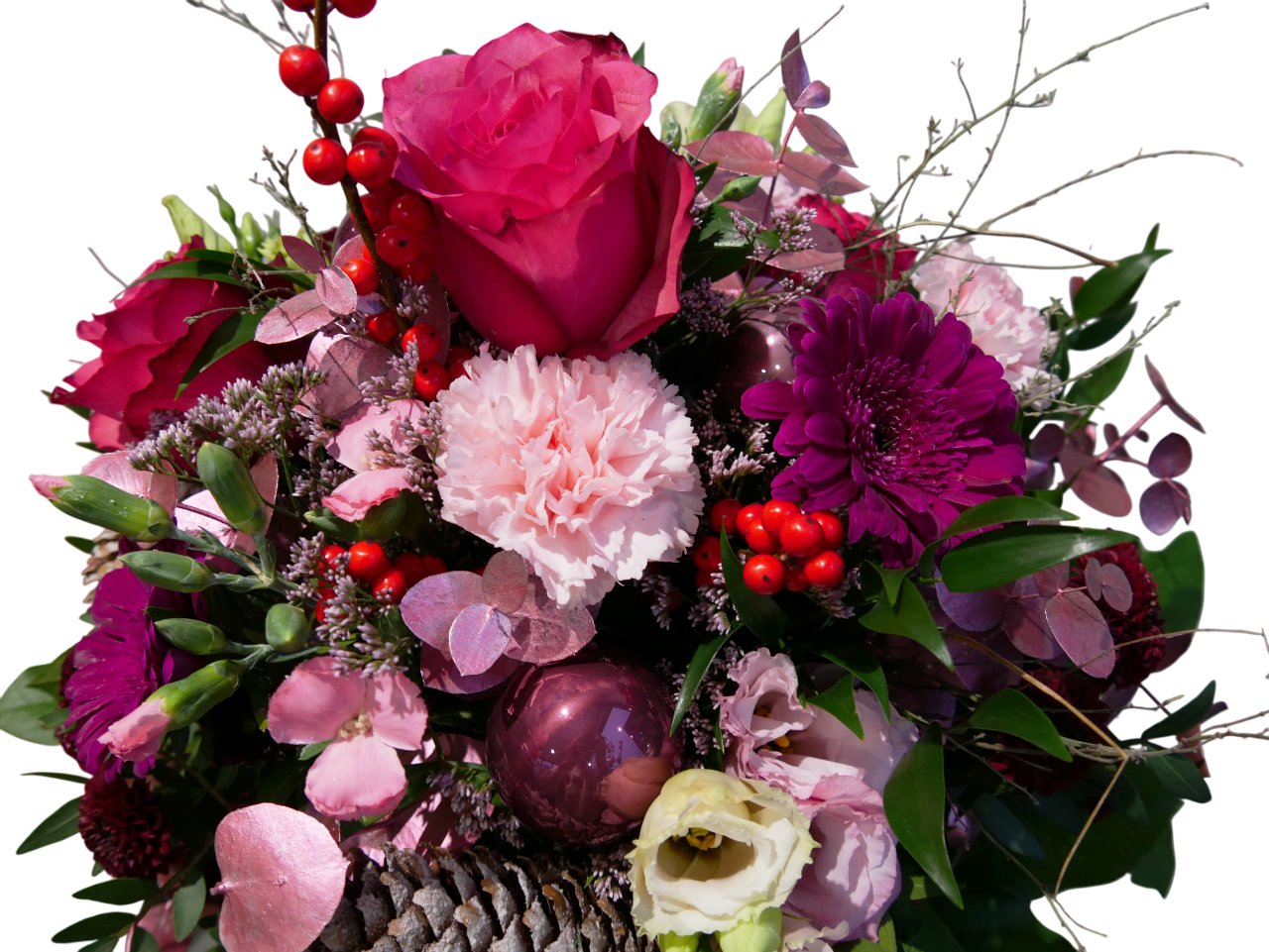 Satte Rosen, zarte Nelken und leuchtende Chrysanthemen treffen auf glänzende Kugeln, Beerenzweige und strukturreiches Grün – ein Arrangement, das moderne Weihnachtsstimmung in ihrer schönsten Form zeigt.