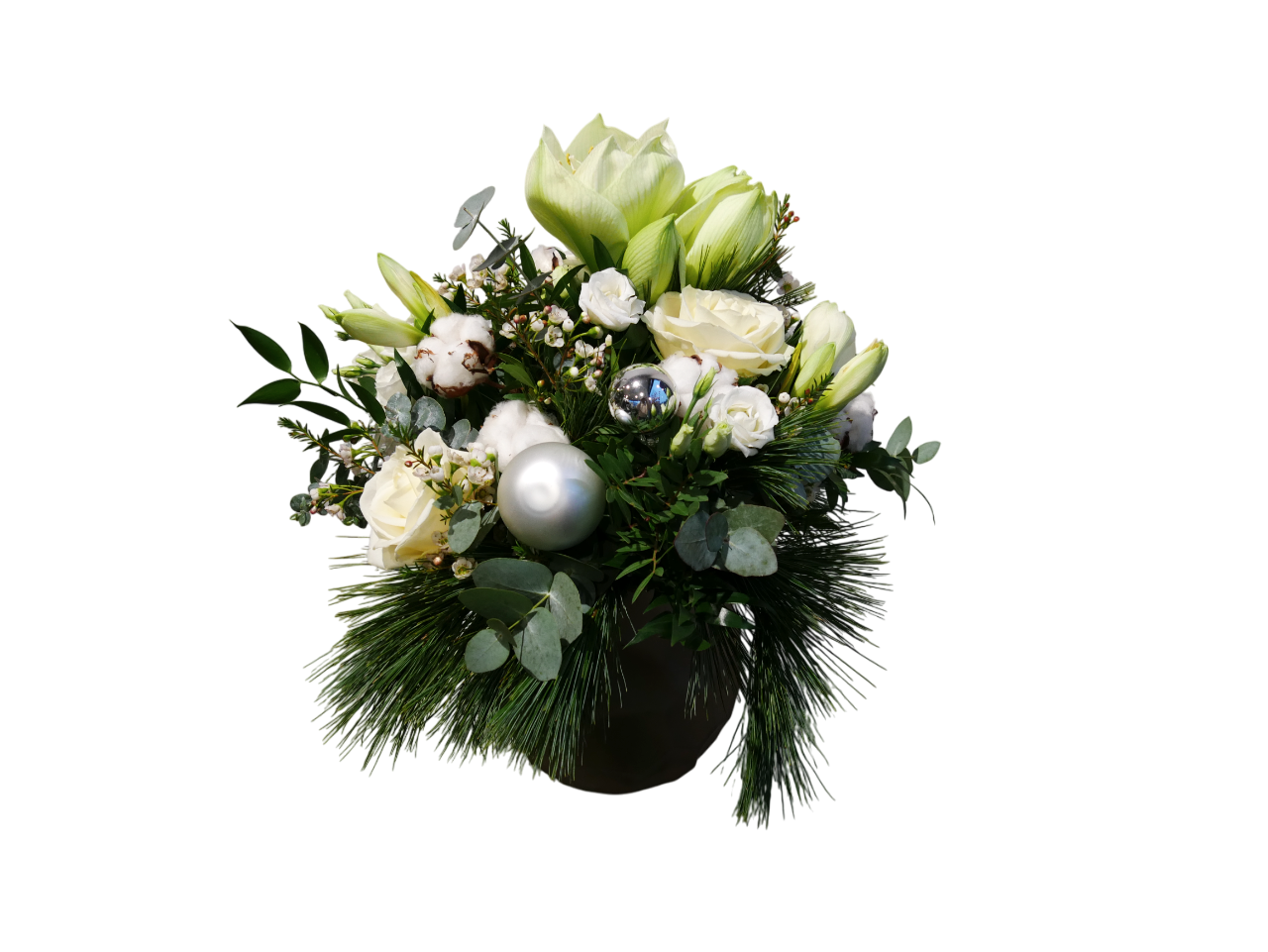 Helle Amaryllis, feine Rosen und weiche Baumwolle treffen auf duftiges Tannengrün und schimmernde Akzente – ein Arrangement, das Ruhe, Stil und festliche Klarheit ausstrahlt.