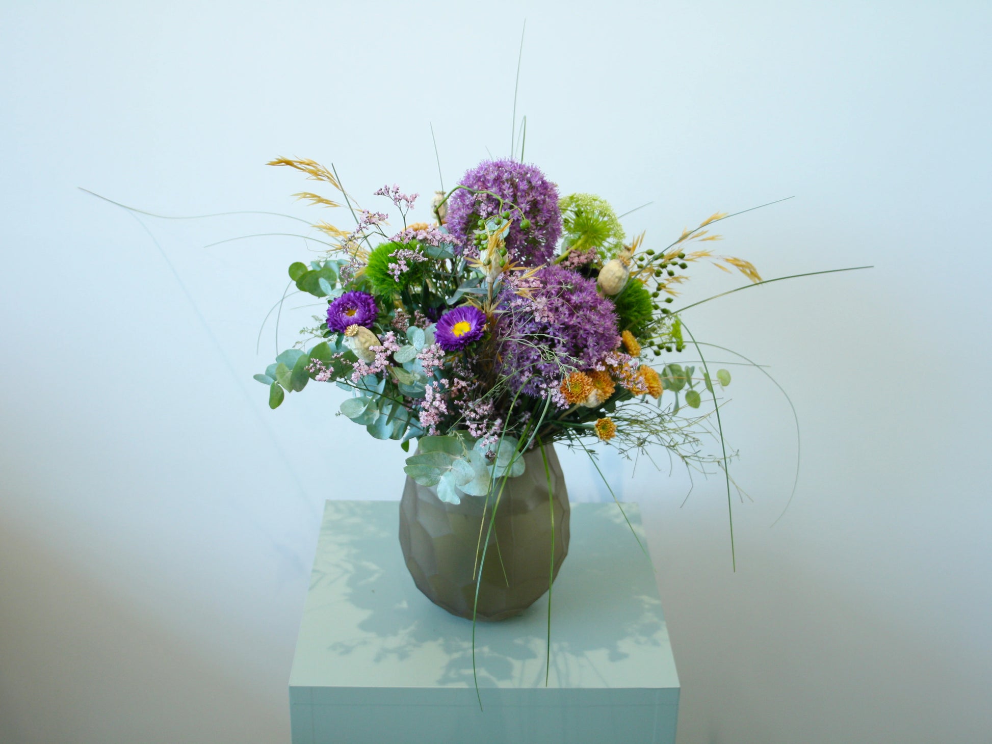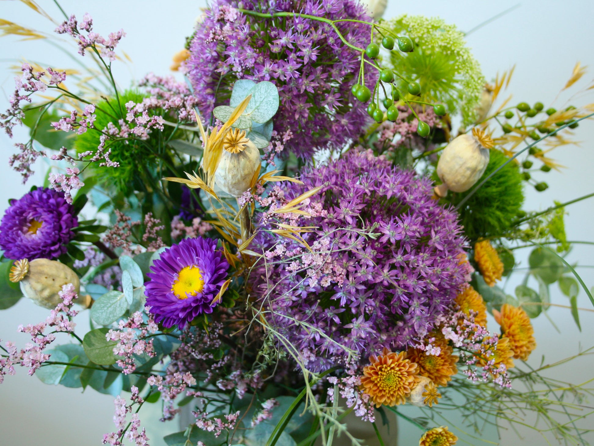Leuchtendes Violett, sonniges Orange und zartes Rosa werden durch getrocknete Mohnkapseln, filigrane Gräser und frisches Grün harmonisch ergänzt – ein Arrangement voller Energie und Lebensfreude.