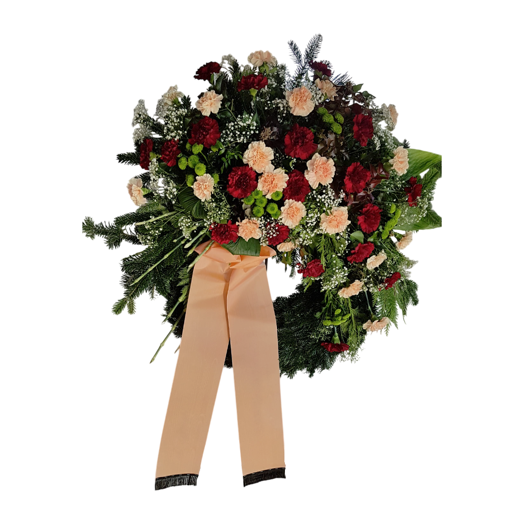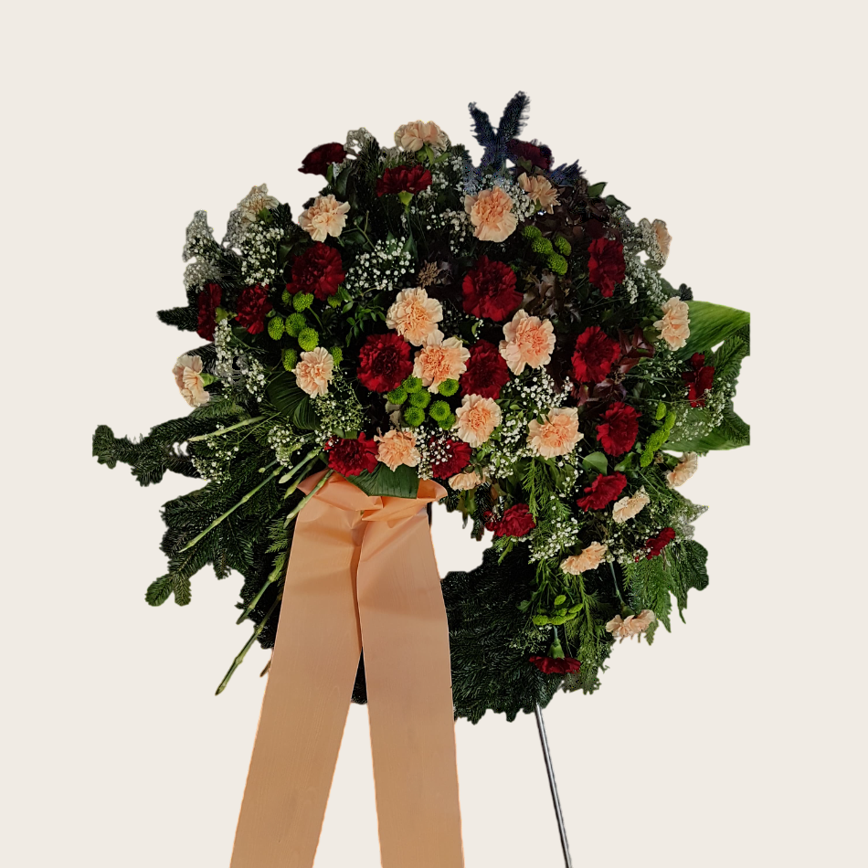 Ein letzter Gruß voller Wärme und Wertschätzung: Dieser handgefertigte Trauerkranz kombiniert kräftig bordeauxrote und zart apricotfarbene Nelken mit frischem Grün, Schleierkraut und Santini. Die harmonische Farbgebung vermittelt Nähe, Dankbarkeit und bleibende Erinnerung. Eine apricotfarbene Schleife mit Platz für persönliche Worte rundet das würdevolle Arrangement stilvoll ab.