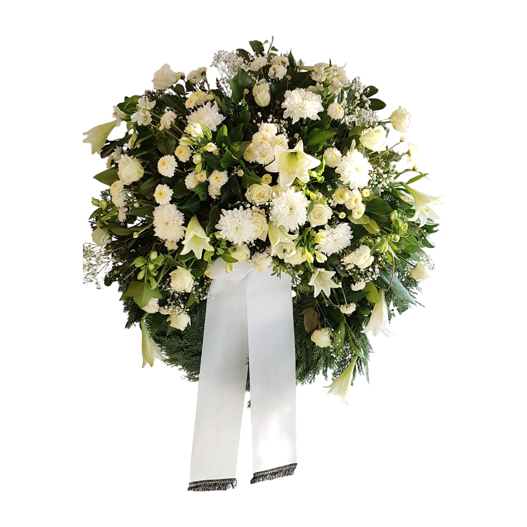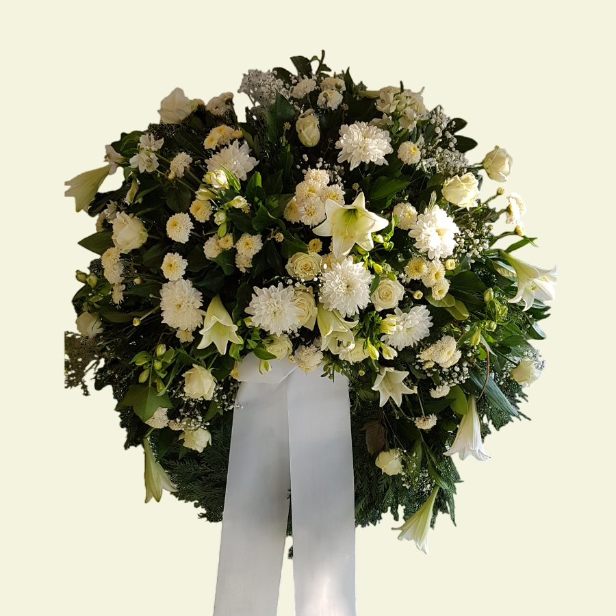 Ein Ausdruck tiefster Anteilnahme und stiller Würde: Dieser handgefertigte Trauerkranz in reinem Weiß vereint edle Lilien, Rosen, Chrysanthemen und zartes Schleierkraut zu einem harmonischen und friedlichen Gesamtbild. Die weiße Farbgebung steht symbolisch für Licht, Reinheit und Hoffnung – und verleiht jeder Abschiedsfeier eine würdevolle Atmosphäre. Eine schlichte weiße Schleife mit optionalem Wunschtext macht den Kranz zu einem sehr persönlichen letzten Gruß.